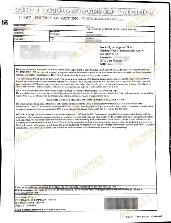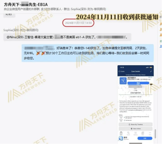 2024 年 8 月 16 日,在方舟天下团队的协助下,Y 先生的 EB1A 申请材料正式寄出。考虑到 Y 先生的职业发展节奏,团队在审理期间及时启动加急程序。2024 年 11 月 11 日,移民局传来喜讯 ——Y 先生的 EB1A 申请全程零补件,仅用 2 个月审理周期即一次性获批。