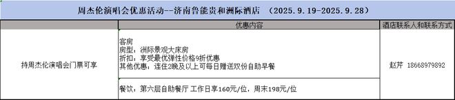 2.2025年9月19日至22日,入住酒店凭房卡和济南周杰伦演唱会门票即可享受一次自助餐99元/位。