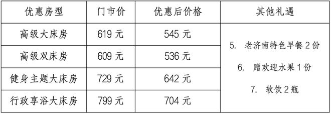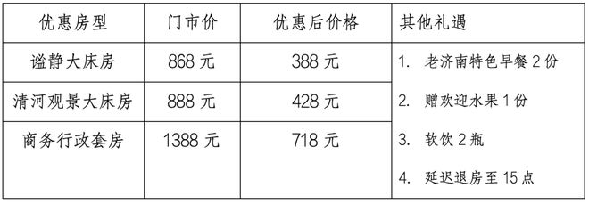 2025年9月19日至9月28日,推出凭济南周杰伦演唱会门票入住本酒店优惠活动,参与优惠房型(豪华大床/标间),按门市价五折优惠,优惠后349元/间晚(不含早)。