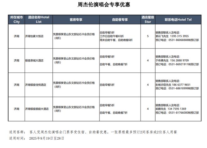 2025年9月19日至9月28日,凭济南周杰伦演唱会门票入住以下4家酒店享受如下优惠活动: