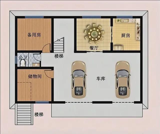 一层是架空层设计的都是功能区,前面就设计了车库方便停车,保证爱车不受雨淋。车库内部也有楼梯可以通往二层,下雨下雪都不需要担心。一间备用房,后期可以改造成自己需求的样子,比如:卧室和影音室,包括健身房或棋牌室均可;方便日常的生活起居功能实用就行,一间做个储藏室还可以摆放杂物,家里杂物再也不需要担心没有地方收纳了。反正怎么舒服就怎么设计!厨房做有隔断,有效隔绝了油烟,室内更加干净,一家人围坐在一起吃饭,欢声笑语,满满的都是幸福。