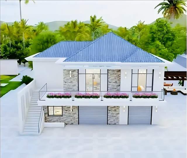 这别墅的色彩搭配也是一绝。两侧外墙是珍珠白色的真石漆,这种颜色清新雅致,温暖柔和,在阳光照耀下,明亮又温暖。深蓝色的屋顶采用了坡屋顶设计,保温隔热又防水,功能和美观兼容。前后开窗采光和通风都不错,整体沉稳大气,庄重内敛,两者搭配在一起,独特的魅力和优雅气质就出来了。
