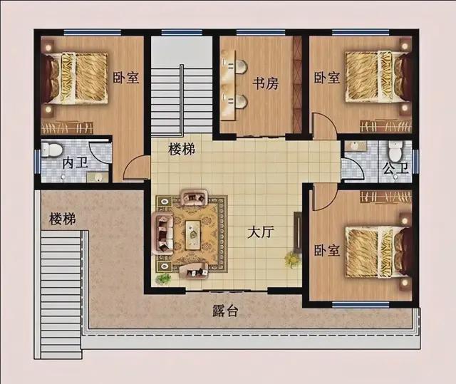 沿着外设楼梯上到二层,设有开放式的客厅,平日可以休闲娱乐、在这里招待客人。设有三间卧室,左边的主卧套房带内卫可以做尊亲房,安静舒适,方便日常起居使用;另外两间温馨的卧室,方便家里人居住,偶有客人来访也有房间可以使用。外面那个超大露台贯穿东西,在这里可以尽情享受阳光和清风,要是在这里办个聚会,和亲朋好友一起品茶聊天,欣赏田园风光。